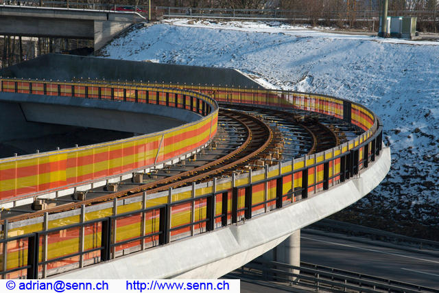 13.03.2010 Entlang dem Zentrum Glatt und über der Autobahn wurden bereits die Gleise verlegt. Deutlich ist die Überhöhung in der Kurve zu sehen. (Grössere